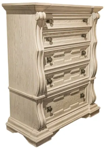 Inspired by the grandeur and grace of European traditional style, this opulent chest of drawers is nothing short of stunning. Its large-scale decorative scrolled pilasters, along with an ash swirl border and walnut inlay crowning the top, are sure to make a sophisticated statement in your restful retreat.