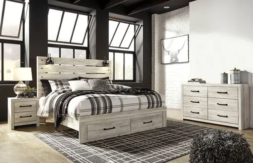 This Cambeck bedroom set offers a blend of rustic charm and modern functionality. This set includes a panel bed, a six-drawer dresser, and a matching mirror, all featuring a whitewash finish that highlights the wood grain, creating a cozy and inviting bedroom atmosphere.