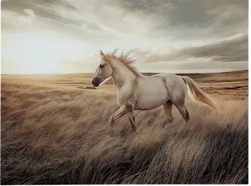 This wall art brings serene beauty to your home. This captivating print on glass captures the grace and majesty of a wild horse galloping through a golden field. The warm, earthy tones and dynamic composition create a sense of freedom and movement. It's a perfect choice to enhance your wall decor with nature-inspired artistry.