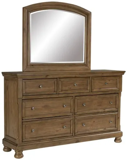 A relaxed take on casual traditional design, this dresser with mirror strikes a comfy pose with a classic sensibility. Its timeless design and chestnut brown wood tone create a welcoming retreat tailored to your laid-back lifestyle. Metal knobs in an aged pewter color subtly dress up drawers packed with storage possibilities.