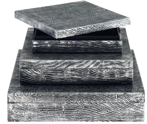 Ideal for a dresser, chest or accent table, this set of three wood and metal boxes is a contemporary choice for the forward-thinking modernist. The antiqued pewter-tone finish is an inspired touch.
