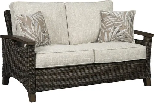 Pretty enough for trendy interiors, yet durable enough to weather the elements, the Paradise Trail outdoor loveseat rises to the challenge beautifully. Handwoven resin wicker over rust-proof aluminum merges high style with low maintenance.Rest assured, though the exposed armrests and feet look remarkably like wood, their sturdy aluminum construction is perfectly suited for alfresco living. Plush seat cushions and throw pillows wrapped in high-performing Nuvella® fabric aim to please.All-weather, handwoven resin wicker over rust-proof aluminum frameArmrests with wood-like finish2 throw pillows includedSeat cushions and pillows covered with high-performance Nuvella® fabricClean fabric with mild soap and water, let air dry; for stubborn stains, use a solution of 4 oz. bleach to 28 oz. waterAll-weather foam cushion core wrapped in soft polyesterShips in single boxImported fabric and fill*Loveseat only, any other products that may be displayed are sold separately. Images may not represent the actual size and color in images may differ in person. See store for actual color or finish.