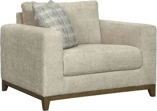 Serene style with a modern sensibility. Delight in the cozy, versatile embrace of this oversized chair. It takes an on-trend approach to irresistible texture and natural beauty, showcasing soft upholstery accented with a transitional wood trim.