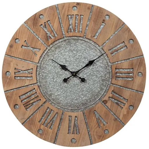 This wall clock is on time with industrial farmhouse style. Natural wood pairs beautifully with galvanized metal to create its large Roman numerals and sun design. The clock’s ample scale makes it a gorgeous focal piece for your wall.