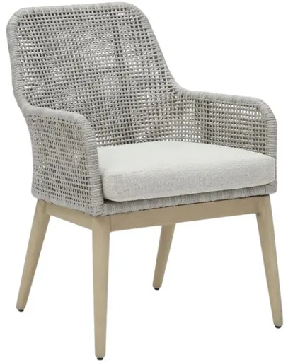 This dining arm chair invites your casual contemporary style outdoors. With its resin wicker in a chic neutral hue, it expertly marries refined design with durability. Breezy summer mornings and cold winter nights are made all the more comfortable with high-performance Nuvella+™ fabric covering the seat cushion.