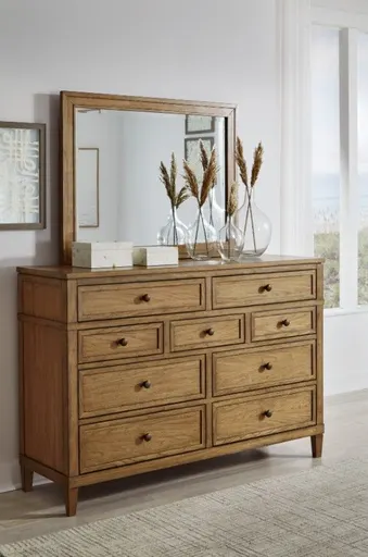 Taking a timeless approach to bedroom beauty, this dresser with mirror brings easygoing elegance to the everyday. With its light brown wood tone, it seamlessly slips into your room’s aesthetic. Dark bronze-tone pulls accent the assorted storage drawers, adding to this dresser's fresh approach to transitional stylings.