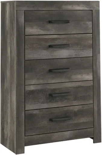 Add rustic charm to your casual home with the Wynnlow collection. This chest of drawers is sure to win your heart with its daring designer take on modern rustic. The bedroom chest’s crisp, clean and minimalist-chic profile is enriched with a striking replicated oak grain with thick plank styling and a weathered gray finish for that much more authentic character.