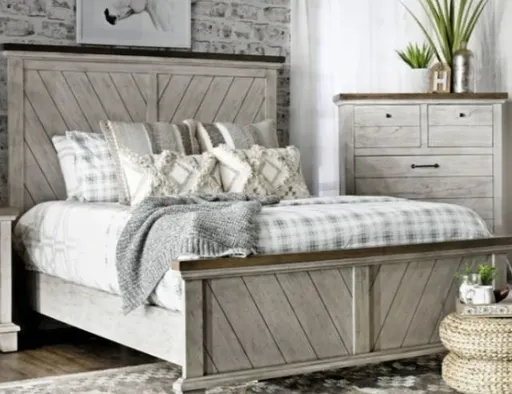 A rustic, farmhouse-inspired bed, Bear Creek features a white-smoke finish that contrasts beautifully with honey-smoke-stained tops and cap rails. The chevron-patterned headboard and footboard is offered in King and Queen sizes it offers a variety of storage items with ultra-deep drawers supported by side drawer glides for easy operation.