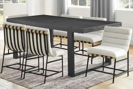 Upgrade your dining space with this sleek and modern 7-piece dining set, featuring the Yves 77-95" inch dining table with a striking black wire-brushed finish and six Nicco eggshell polyester side chairs. The Yves table combines style and function,, featuring a double pedestal base and solid mango wood.