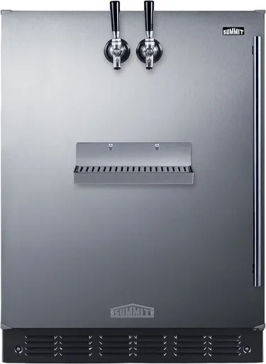 Summit's innovative series of commitment-free built-in kegerators offers maximum convenience, eliminating the need to make alterations to countertops while still keeping easy access to cold brew coffee on tap in commercial and residential settings. The SBC7BRSFRTPCFADALHD is unique because the twin taps are accessed via the unit's front door. The specialized design frees up valuable counter space in kitchens, home bars, coffee shops, and eateries with limited room. The kegerator can be installed under a counter without the need to modify the countertop with a hole for the draft tower. The front tap system also creates a more accessible kegerator experience. This kegerator ships fully assembled and includes a removable stainless steel drip tray that mounts on the door below the taps. Its commercial grade tower has two faucets serving cold brew coffee from two 1/6 (sixtel) kegs. We also include a CO2 tank, regulator, and all the equipment you need to confidently serve perfectly chilled cold brew coffee on tap. Sized with a 24" footprint, this is a versatile front tap cold brew coffee dispenser that is ETL-S listed to NSF-7 standards for use in commercial environments, as well as residential settings. At just 32” high, this unit is ideal for built-in installation under lower ADA compliant counters. The stainless steel door and full-length handle provide an attractive look. The SBC7BRSFRTPCFADALHD features a modern black interior liner and stainless steel floor, providing added protection when loading kegs. The interior light, with an on/off rocker switch located behind the dial thermostat, ensures visibility and convenience. Classic mechanical controls guarantee an intuitive, trouble-free performance without any internal boards or chips. The automatic defrost system reduces user maintenance, while our signature cold wall design ensures an efficient, reliable cooling system. In addition to this dual tap kegerator, our commitment-free line also includes choices that dispense beer, as well as model SBC7BRSFLTWADA which features our innovative floating tap design. Summit also manufactures similar kegerators in standard heights and for outdoor applications. Browse the full Summit product line or contact our product specialists to find the fit for your needs.