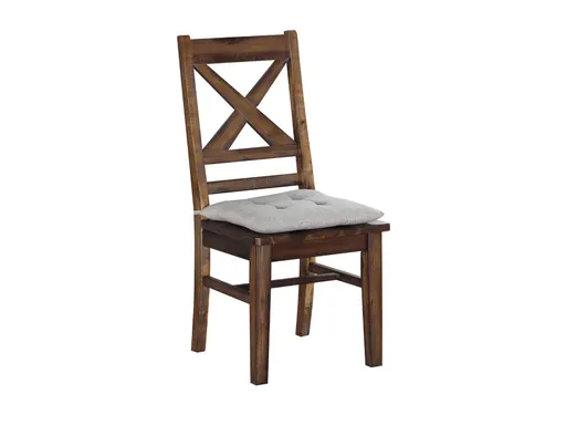 The Acacia Side Chair is a stylish and comfortable addition to your dining space, featuring a warm brown finish with weathered detailing that adds character to the design. The X back frame not only provides sturdy support but also brings a touch of rustic charm to the chair's aesthetic. Designed for both style and comfort, the chair comes with a beige cushion that attaches to the seat, offering a cozy and inviting seating experience. The cushion can be detached for easy cleaning or customization. Elevate your dining area with the Acacia Side Chair, where the blend of warm tones and thoughtful detailing creates a welcoming atmosphere for family and guests alike.