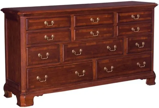 Triple dresser with eleven drawers is the perfect size for storage. Bracket feet with reeded pilasters and inlays make this piece a must have. Sheraton along with Queen Anne elements create this beautiful assortment of furniture. Cathedral cherry veneers, rubberwood solids and select hardwoods create an exciting collection of bedroom and dining room from American Drew.