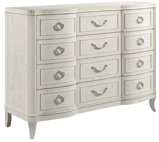Beautifully crafted with a serpentine shape and elegant tapered saber legs and raised bead, this dresser will add sophistication to your bedroom. It is constructed of cathedral white oak veneers in an Eggshell finish, and comes equipped with a removable jewelry tray in the top center drawer, cedar lined bottom drawers.