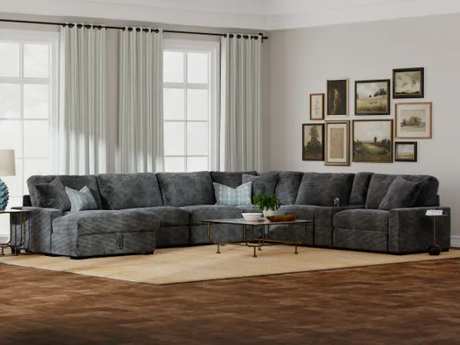 The Ash 6 Piece Power Sectional offers oversized comfort and multifunctional design, making it the perfect centerpiece for lounging, entertaining, or hosting overnight guests. Upholstered in a soft gray corduroy-style polyester fabric, this sectional brings inviting texture and a modern, casual feel to any living space.