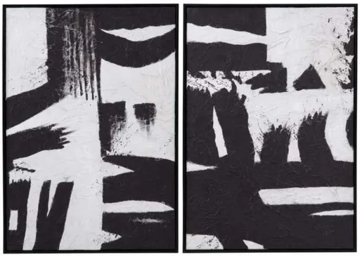 "Black and White" presents a captivating 2-piece set of hand-painted canvases elegantly framed in black molding. This monochromatic masterpiece exudes timeless elegance and sophistication, offering versatile styling options to complement any interior decor scheme with its bold contrast and minimalist aesthetic.