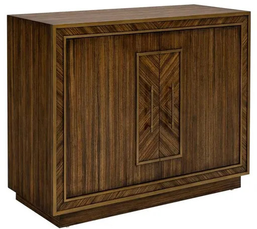 The Claudia Accent Cabinet showcases a contemporary design infused with Art Deco influences. Crafted from zebrano veneers in a medium brown finish, it features striking painted antique gold accents and custom hardware for a distinctive look.