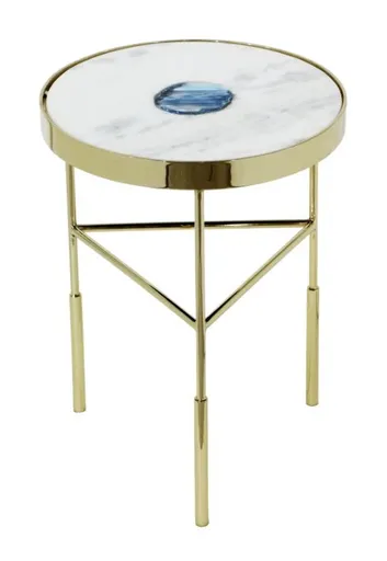 The Delilah accent table features modern contemporary styling with a polished gold metal frame and a white marble top that is inset with a slice of agate. Each piece of stone is unique in color and shape.