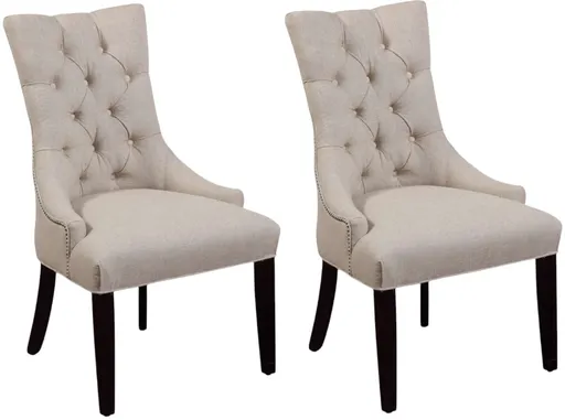 The Fortnum Parsons Chair presents a button-tufted back and a gently sloped silhouette, crafted from Linen fabric for a classic touch. Its sturdy frame showcases rich hardwood legs complemented by chrome nailhead trim, adding a touch of elegance. With its traditional styling, this chair exudes timeless appeal, perfect for blending seamlessly into any decor scheme.