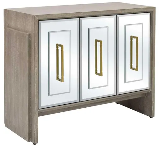 The Lansing Server showcases modern-glam style with a cerused grey oak case and sleek mirrored doors. Accented by brushed gold bar-pull hardware, it adds a touch of luxury to any space. Behind its three doors, the interior offers three adjustable shelves and an additional drawer for versatile storage.