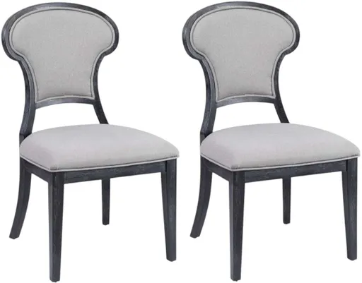 The Mateo Dining Chair features transitional styling. Features a curved seat back with tapered front legs and tapered flared back legs. The wood frame is finished in black oak veneer, complementing the gray rub-through style upholstered fabric on the seat and back.