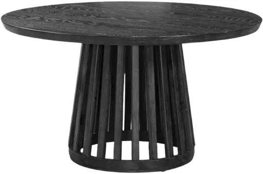 The Mateo round dining table features a round tapered slat base design for a contemporary style. Finished in a ceruse black oak veneer. Additional features include adjustable floor levelers. Comfortably seats 4 people.