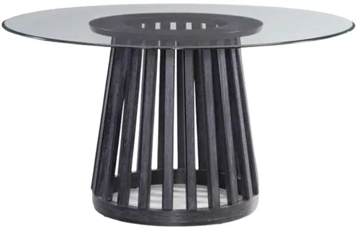 The Mateo Round Dining Table features a round tapered slat base design for a contemporary style. Features a 54" round clear glass table top. The wood table base is finished in a cerused black oak veneer. Additional features include adjustable floor levelers. Comfortably seats 4 people.