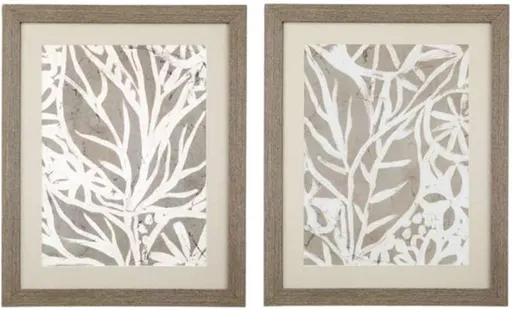 Mudcloth Foilage is a set of two that features fine art cotton rag paper and a 2" rustic grey molding and an oyster matt board. Update your home in a stylish manner with this beautiful wall art. Perfect style for your living room or home office.