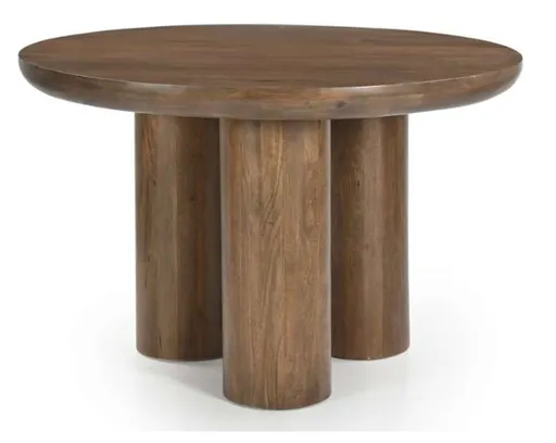The Napa Dining Table embodies a harmonious blend of modern and rustic elements, featuring a solid brown mango wood construction. Its 48" round table top boasts a soft-rounded profile edge, while three overstated column-style legs provide sturdy support and visual interest. Hand-crafted from natural solid mango.