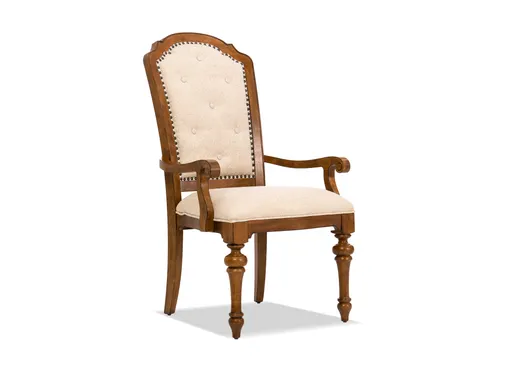 Elevate your dining experience with the timeless elegance of the Berkshire Arm Chair. Crafted with warm brown hickory veneers, this chair exudes a sense of tradition and sophistication that enriches your dining space.The cream-colored upholstered seat and back provide comfort and refinement, creating a harmonious contrast against the wood frame. The nailhead trim on the back adds a touch of intricate detailing, enhancing the overall charm of the chair. The wood arms contribute to the classic styling, adding a touch of warmth and comfort.Designed with attention to detail, the sculpted turned front legs reflect the classic design elements, adding to the overall traditional appeal of the chair.Experience the perfect blend of tradition and comfort with the Berkshire Arm Chair – a testament to quality craftsmanship and tasteful design that transforms your dining area into a haven of beauty and conviviality.