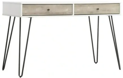 This white writing desk offers a spacious surface for everyday tasks and organization. It includes two oak taupe drawers for keeping essentials within reach and sturdy metal legs that ensure lasting support and durability for daily use.