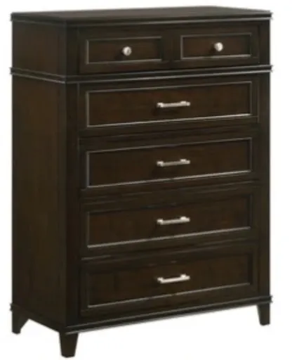 Elevate your bed room with this Nova II Chest from Bernards. Shown in a dark brown color finish, this dresser features 5 drawers that provides storage for personal items and can be a decorative piece in the room. Make a bold statement by incorporating this furniture to your home.