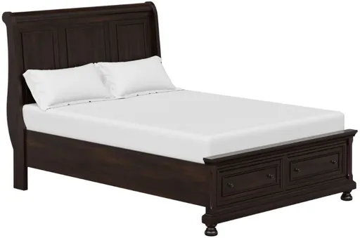 The Prescott Storage Sleigh Bed features a classic sleigh design with a rich cherry finish, offering timeless elegance. Part of the Prescott cherry bedroom set, this bed includes two spacious storage drawers built into the footboard for convenient, hidden storage. The sleek paneled headboard and curved lines bring sophistication to any bedroom.