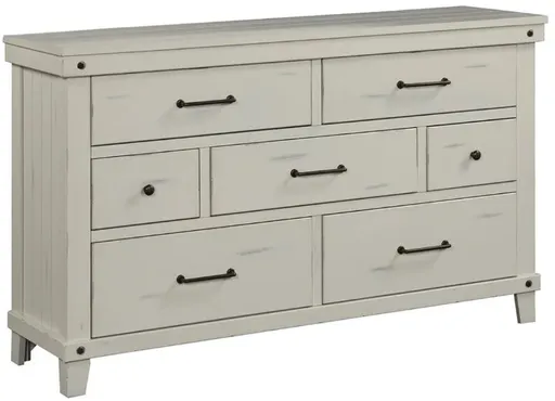 Transform your bedroom into a chic, modern farmhouse retreat with our Spruce Creek Dresser in distressed white. The 7 spacious drawers, accented by side paneling and black industrial hardware, provide ample storage while adding a touch of rustic charm. Elevate your space with this eye-catching piece!