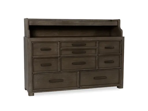 The Blanchard Dresser and Hutch combines functional storage with an elevated design that makes a statement in your bedroom. Crafted from hardwood solids and oak veneers in a soft gray wash, it showcases the natural beauty of the wood grain while offering durability for everyday use. The dresser includes nine spacious drawers for ample storage, with the top drawers lined in soft-touch felt to protect delicate items. Metal hardware provides a sleek contrast that enhances the dresser’s clean lines and modern appeal.