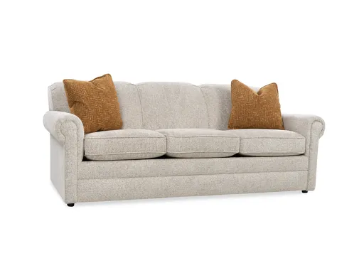 Discover the perfect blend of style and functionality with the Bryce Queen Sleeper Sofa. Upholstered in a sophisticated cream fabric, this sleeper sofa not only provides a comfortable seating option for your living space but also transforms into a convenient bed for overnight guests. Designed with rounded arms for a touch of elegance, the sofa comes with two rust-colored throw pillows that add a pop of color and accentuate the overall aesthetic. Crafted in the USA, the sofa ensures quality and durability. The sinuous wire support and block foam with poly fiber wrap contribute to a supportive and plush seating experience. For those who appreciate customization, visit our retail location to explore a variety of fabric options that suit your taste and complement your home decor. Elevate your living room with the Bryce Queen Sleeper Sofa, a versatile and stylish addition to any home.
