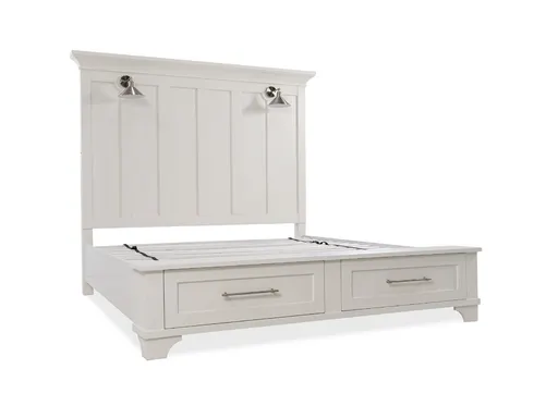 Indulge in the timeless allure of the Carlisle Bed, available in King or Queen size. This white storage bed, crafted from pine solids and veneers, seamlessly combines functionality with farmhouse style. The footboard features two drawers, offering convenient storage for your essentials. Enhancing its aesthetic appeal, the bed is adorned with brushed nickel hardware and framed drawer fronts, creating a harmonious blend of modern and rustic elements. Immerse yourself in the ambient glow provided by the two nickel-finished LED touch lamps on the headboard, adding a touch of sophistication to your bedroom. Experience the perfect marriage of style and practicality with the Carlisle Bed, where thoughtful design meets quality craftsmanship. Elevate your bedroom with this exquisite bed, creating a serene and stylish retreat in the heart of your home.