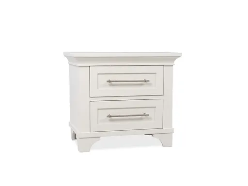Introducing the Carlisle Nightstand, a charming addition to your bedroom that seamlessly blends farmhouse style with modern functionality. Crafted from pine solids and veneers in a classic white finish, this nightstand exudes timeless appeal. The nightstand features two drawers with framed fronts, providing ample storage space for your bedside essentials. The brushed nickel hardware adds a touch of sophistication, enhancing the overall aesthetic. Convenience meets modern living with double USB chargers and a wireless charger, allowing you to keep your devices powered without the clutter of cords. Experience a touch of elegance with the adjustable LED nightlight, creating a warm and inviting ambiance. The Carlisle Nightstand is not just furniture; it's a thoughtful addition to your bedroom ensemble, where form and function converge seamlessly. Elevate your bedtime routine with this exquisite nightstand, bringing both style and practicality to your personal sanctuary.