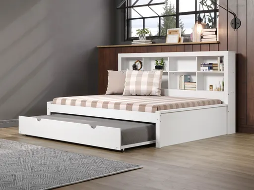 The Carter White Full Bed is a functional and stylish piece of furniture that is perfect for any child's or teen's bedroom. The bed comes with a trundle that can be used for additional sleeping space, making it ideal for sleepovers or unexpected guests. The built-in bookcase provides a convenient storage solution for books, toys, or decorative items, helping to keep the room organized and clutter-free. With its clean and simple design, the Carter White Full Bed is a great choice for those who want a versatile and practical piece of furniture that can grow with their child.