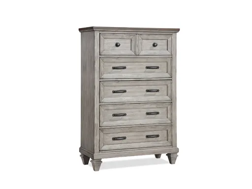 Enhance your bedroom's allure with the Clark Chest, a testament to the seamless marriage of style and utility. The vintage creme finish, complemented by a rich brown top, exudes an air of sophistication that effortlessly merges with your interior decor. Boasting five drawers, this chest offers generous storage space while maintaining a sleek and uncluttered look. The chest's drawers are a hallmark of exceptional craftsmanship, featuring ball bearing glides for smooth and quiet operation, French and English dovetail construction for enduring strength. This piece exemplifies a commitment to both form and function, catering to your storage needs while elevating your living space's aesthetic. The Clark Chest is an embodiment of quality, showcasing meticulous attention to detail and timeless design.