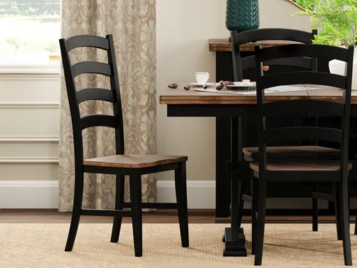 The County Side Chair brings classic farmhouse charm and solid craftsmanship to your dining space. Featuring a traditional ladder back design in a slate black finish, this dining chair is paired with a contrasting light brown seat for a warm, two-tone look. Crafted from solid rubberwood, the chair offers both durability and timeless appeal, making it a perfect match for rustic, cottage, or transitional dining rooms.