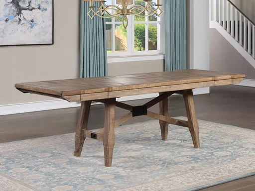 The Dale dining table expands to a full 96 inches with two 12” leaves inserted and seats up to 10. The table is heavily distressed with saw rasping for an heirloom feel and a delightfully casual appearance, The driftwood finish will blend with many decors and complements the beige upholstered chairs perfectly.