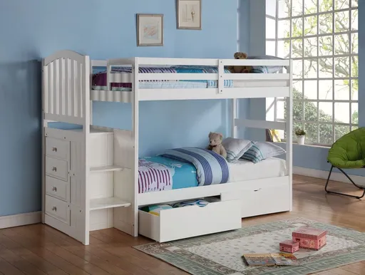 The twin over twin Mission stairway bunk bed adds a warm look to any bedroom with the Mission headboard panels, and warm white finish. The 4-drawer chest is a perfect space saver in any room and can be assembled on either end. Dual underbed storage drawers allow for extra storage and help to keep clutter out from under the bed.