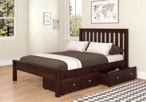 Our Full Contempo Bed has a mission inspired design that will match any décor. The solid pine wood construction gives this bed superior durability that is sure to last for years to come. This twin bed includes a mattress ready slat system eliminating the need for box springs. The included dual under bed drawers create the perfect solution for room organization.