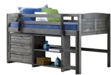 The louvered low loft bed makes a small room fun, with large under bed area for storage or play. The louvered design is timeless and can make a room easy to decorate and give it a warm inviting look. The 3-drawer chest adds storage under the louvered low loft bed. The smaller bookcase adds additional underbed storage.
