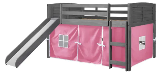 3. Donco Kids Louver Antique Grey Twin Low Loft Bed with Slide and Pink Tent Kit