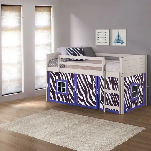 The louvered low loft bed makes a small room fun, with large under bed area for storage or play. The louvered design is timeless and can make a room easy to decorate and give it a warm inviting look. Zebra tent fabric can be used as a fun play area or to conceal storage.