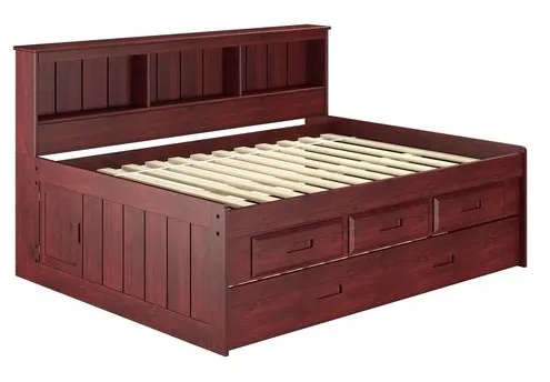 Our Full Daybed with a built-in bookcase is perfect for your growing child. The merlot finish pairs well with any decor. This stylish bed is perfect for maximizing space and keeping the room tidy. Also included are 3-drawer storage and a twin trundle for additional space-saving options.
