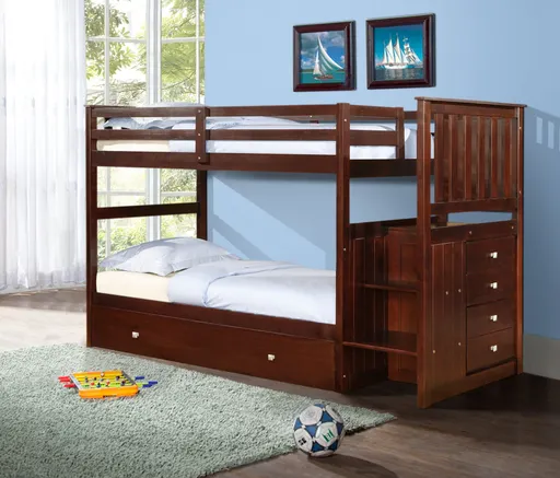 The twin over twin Mission stairway bunk bed adds a warm look to any bedroom with the Mission headboard panels and warm cappuccino finish. The 4-drawer chest is a perfect space saver in any room and can be assembled on either end. The twin roll out trundle is perfect for overnight guests.