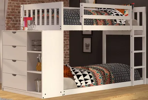 This bunk bed boasts a timeless mission-style design, offering the perfect combination of functionality and style. It comes with ample storage space and a cozy sleeping area for your little ones. Crafted with top-notch materials, the bed has a sleek white finish, making it an ultimate space-saving solution for growing families.