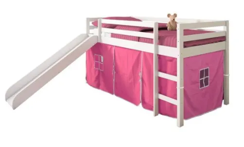 Transition your child from a toddler bed to an exciting twin low loft bed. The included slide makes it fun to get up in the morning. The warm light Espresso finish can easily match almost any decor. The bed is a great space saver in any child's bedroom, with a play area under the bed or open storage area. The pink tent fabric can make for a fun indoor tent area or find all the stored items under the bed.